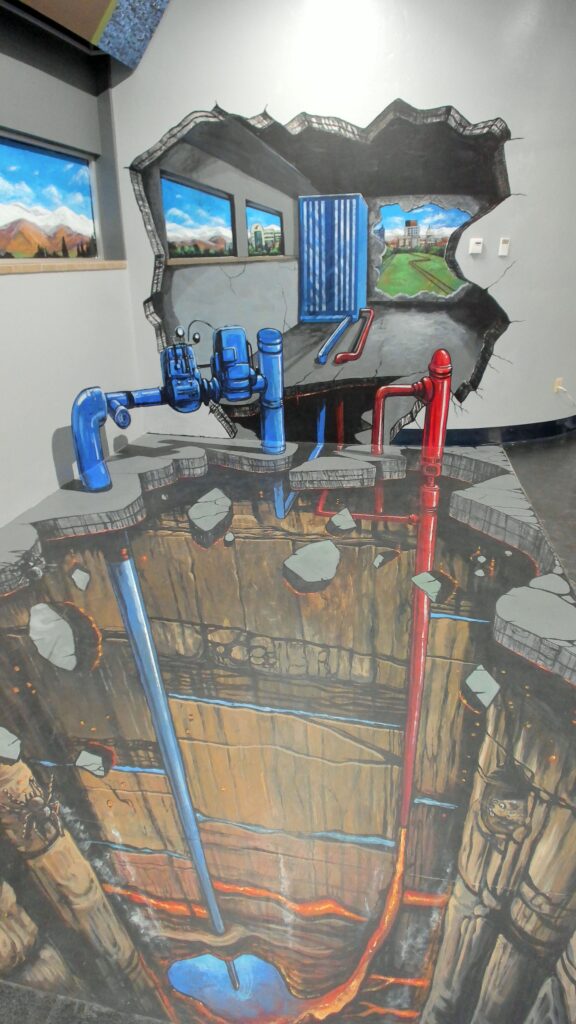 BBarton came up with the exhibit concept for this one! The exhibit features an anomorphic 3D painting, by famed artist Joe Hill, that features a geothermal well, a geothermal heating system, and the Boise skyline. Visitors trigger a photo booth kiosk and then get into position about to fall into the depths of the well as a photo is taken. The photos were automaically uploaded to the cloud and visitors could use a QR code to download them for keeping and sharing.